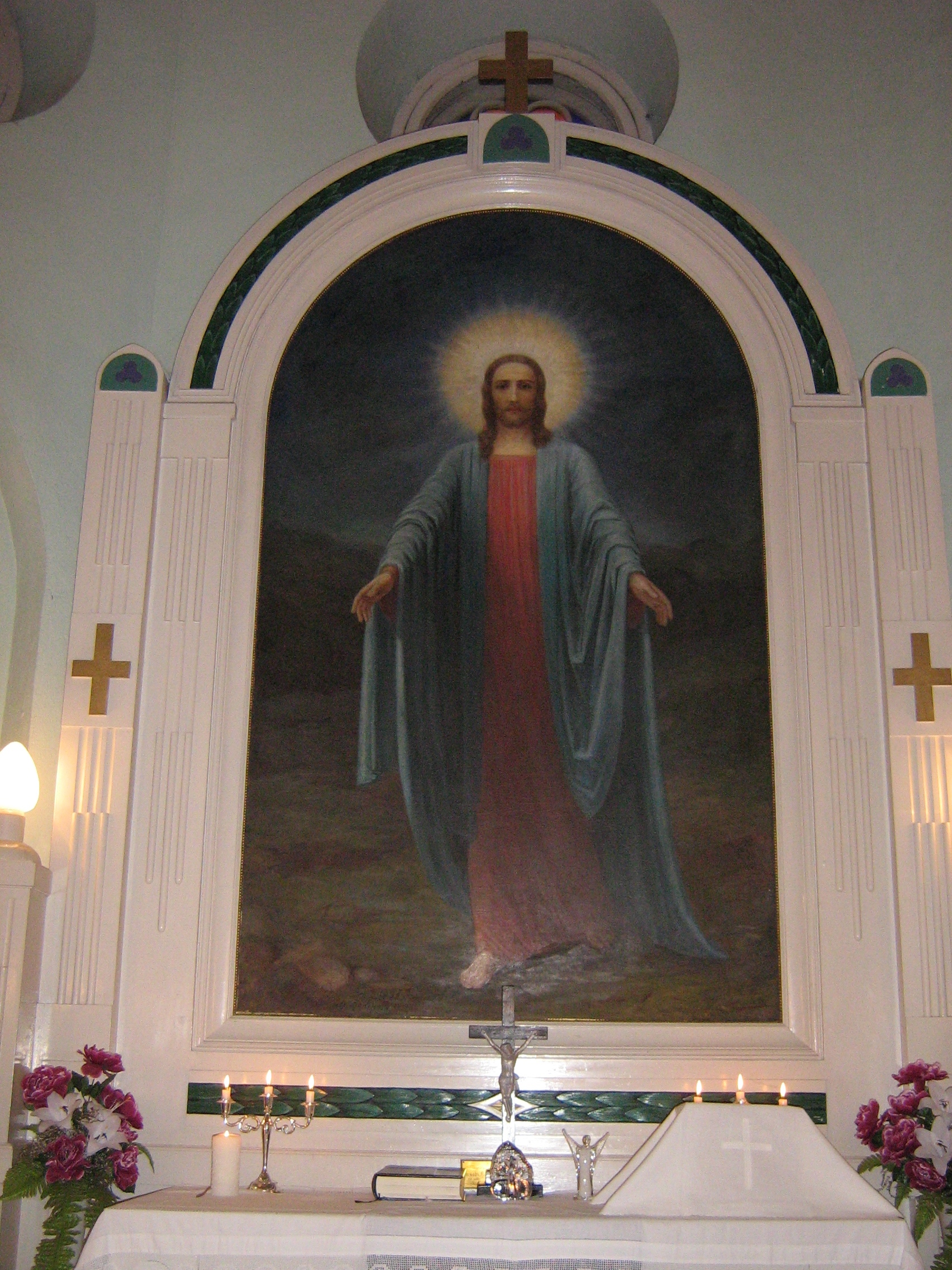Peale moodsa oreli saab kirik weel kaks walgustatud risti, millest üks asetatud kiriku sisse altari kohale, kuna teine walgustatud rist torni tippu asetatud. Torni risti walgustamise wõimaldamiseks on rist ehitatud seest õõnes ja kaetud külgedelt kollase klaasiga. Kiriku kantsel, mis esialgu Tartus walmistada taheti lasta, on nüüd walmistatud Tapal Bernhard Rooba tööstuses. Altaripildi on walmistanud pr. Olga Oboljaninowa Tallinnast. Kiriku elektriwalgustuse sisseseadjaks on a/s. Kapsi ja Ko Tallinnast. Walgustussisseseade sisaldab peale lühtrite 76 walgustuspunkti umbes 5000 küünla walgusega. Maksma on läinud walgustussisseseade umbes 1300 kr., missugust summat wõimalik tasuda kaheaastase järelmaksuga. Uue kiriku ehitamistöid on toetanud ohvrimeelselt nii kohalikud kui ka ümbruskonna elanikud. Üksi rahalisi annetusi on lubatud 93 isiku poolt umbes 800.000 sendi ulatuses, missugused summad ka pea kõik juba kätte saadud. Siis on kiriku ehitamist toetatud weel wäga suurel määral maksuta ehitusmaterjali annetamisega ja tasuta töö tegemisega, üksi kohalik soomusrongide rügement on tasuta tööd teinud kiriku ehitamisel umbes 1000 kr. wäärtuses. Kuna senini kiriku ehitamiseks koguduse kassast wälja antud puhtas rahas 37.000 kr. ümber, siis tasuta tehtud tööde ärajäämisel oleks tulnud raha wälja anda märksa rohkem. Kiriku ehitamist alustades 18. juunil 1931. a. kell 7 hommikul, oli raha kiriku ehitamiseks koguduse kassas umbes 20 tuhande kr. ümber. Uue kiriku pikkuseks on 31 meetrit, laiuseks 14 mtr., kõrguseks seespoolt 12,15 mtr. ja torni kõrguseks kiwiosal 19,8 mtr. ja puuosal 12,2 mtr. Esialgselt on jäetud aga torni puitosa ehitamata ja torni rist on asetatud otse kiwiosale ehitatud ajutisele alusele. Kiriku plaani on walmistanud dipl. arh. Anatoli Podshekajew. Esialgse kawandi järele oli kirik ette nähtud palju suuremana ja ruumikamana, umbes 5000 inimese jaoks. Et aga kokku hoida ehituskulusid, mis suurema kiriku juures oleks tõusnud umbes 100.000 kroonile, siis esialgset suurust wähendati projektil. Uue kiriku ehitustööde lõplik wastuwõtmine ja kiriku tarwitamiseks lubamine toimus 21. skp. wastawa komisjoni poolt.